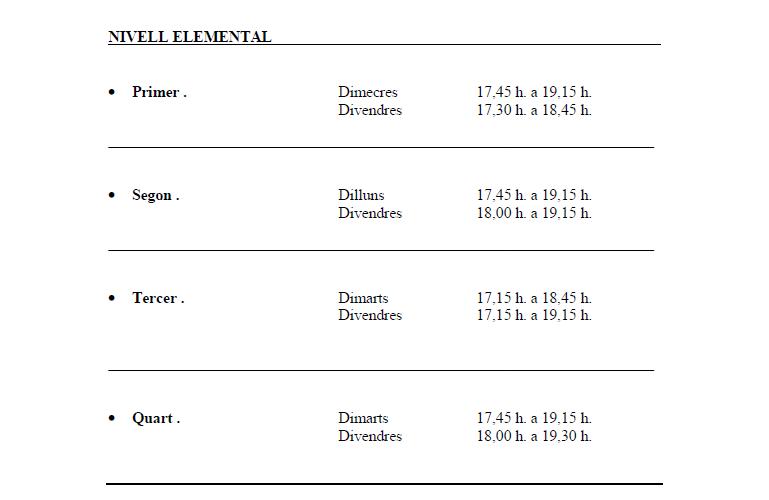 - Primer . Dimecres 17,45 h. a 19,15 h. i Divendres 17,30 h. a 18,45 h.