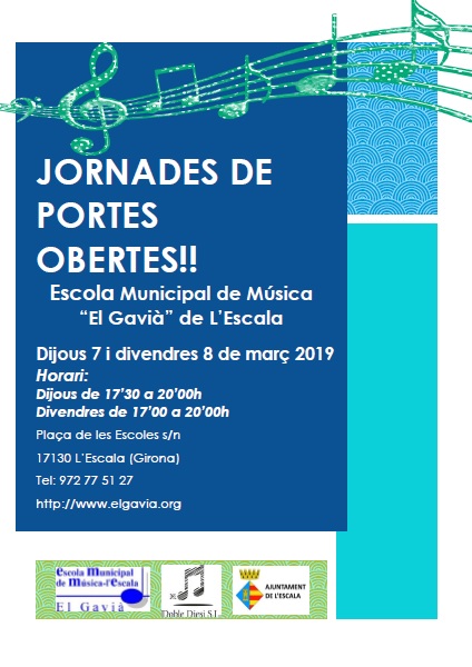 Els propers dijous 7 de 17’30h a 20’00h i divendres 8 de març de 2019 de 17’00 a 20’00h, obrim les portes de l’Escola Municipal de Música “El Gavià”.