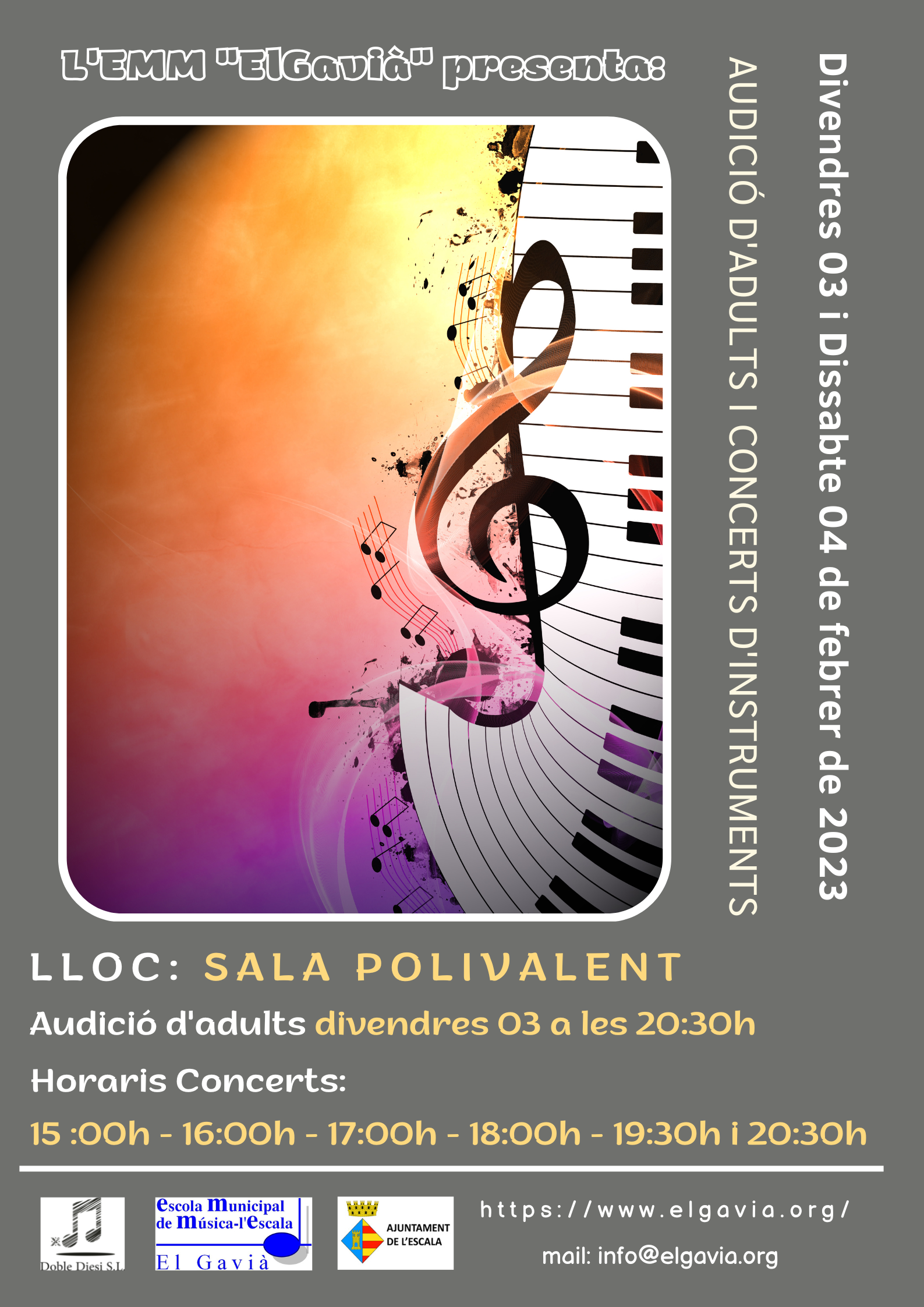 En total varen ser set concerts que es van distribuir en el Concert d’adults, el divendres 18 a les 20’30h i cinc Concerts més el dissabte, a les 15h, 16h, 17h, 18h, 19’30h i 20’30h.