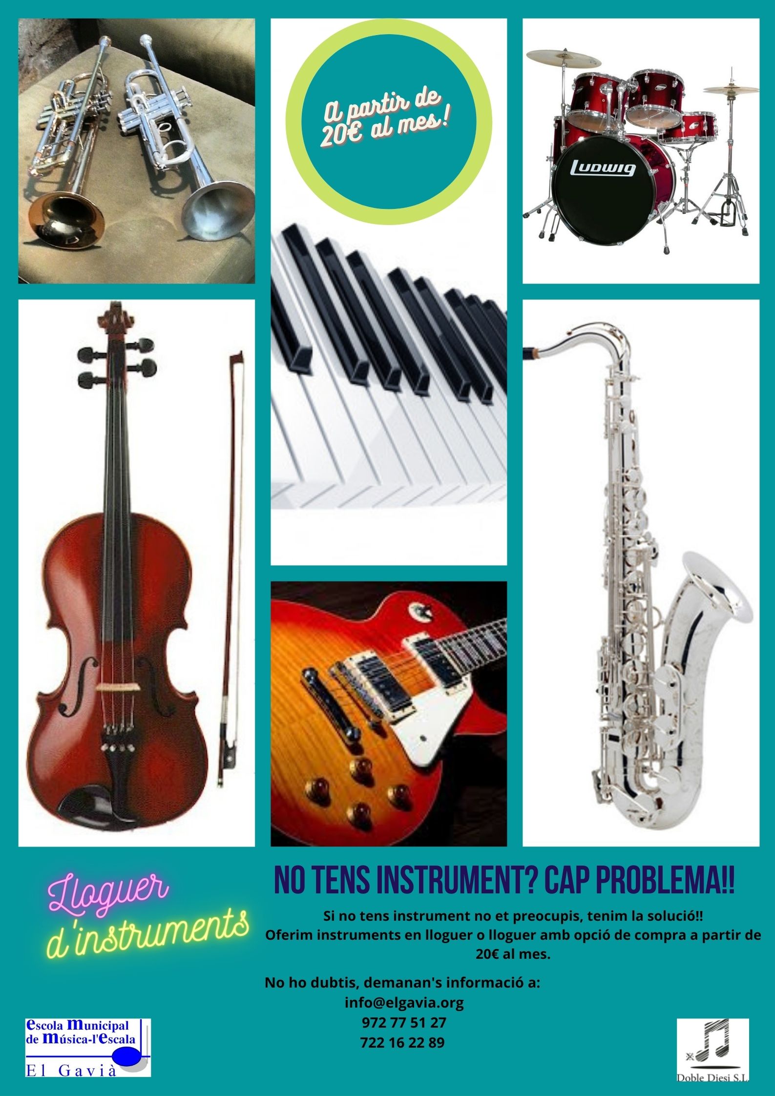 Benvolgudes famílies, us informem que l’empresa gestora de l’Escola de Música (Doble Diesi S.L.), a partir del curs 2021/22 oferirà als alumnes matrículats la opció de llogar instruments o bé de llogar instruments amb opció a compra.