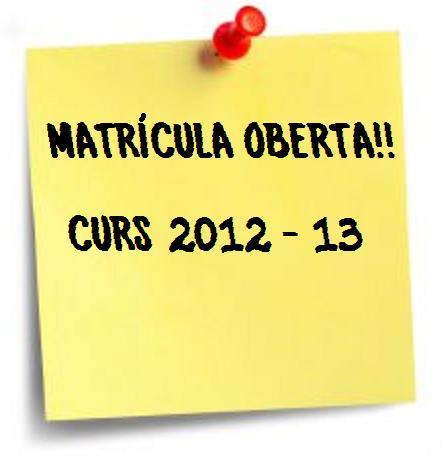 S’informa que s’obre el període de matriculació per al proper curs 2012-2013 seguint les següents dates i horaris: