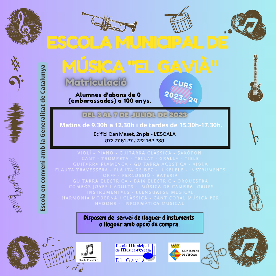 S’obre el període de matriculació de l’escola Municipal de Música “El Gavià”. Serà la setmana vinent, del 3 al 7 de juliol en horari de matins de 9.30h a 12.30h i de tardes de 15.30h-17.30h.